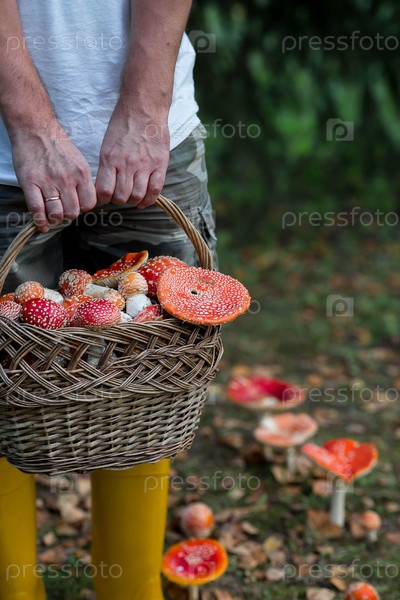 Ядовитые красные дикие грибы в плетеновой корзине и грибные ножки в желтых сапогах. Подборка лягушек. Микродоза отравления ядом или грибами