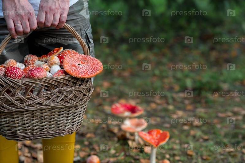 Ядовитые красные дикие грибы в плетеновой корзине и грибные ножки в желтых сапогах. Подборка лягушек. Микродоза отравления ядом или грибами