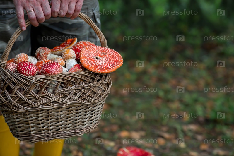 Ядовитые красные дикие грибы в плетеновой корзине в руках сборщика грибов. Сбор грибов Аманита. Отравление микродозой ядом или грибами