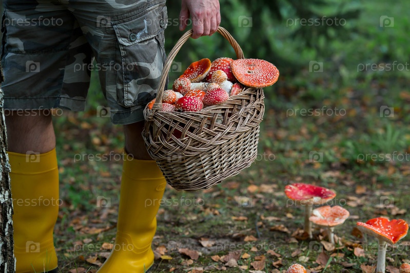 Ядовитые красные дикие грибы в плетеновой корзине и грибные ножки в желтых сапогах. Подборка лягушек. Микродоза отравления ядом или грибами