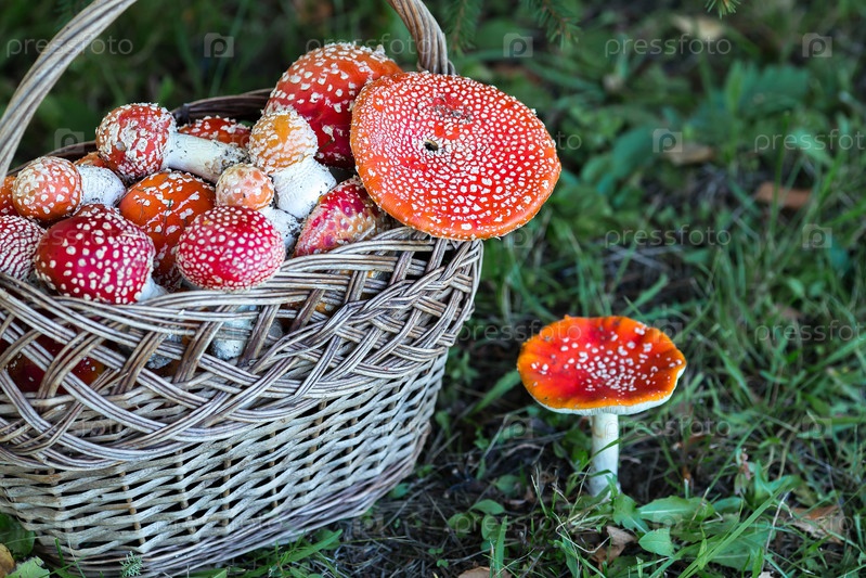 Ядовитые красные дикие грибы в плетеновой корзине. Сбор лягушек. Микродозы отравления ядом или грибами