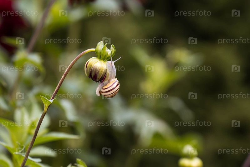 Наземные гастроподные моллюски семейства Helicidae. виноградная улитка (Helix pomatia) на расстоянии цветения. садовый вредитель. съедобная улитка