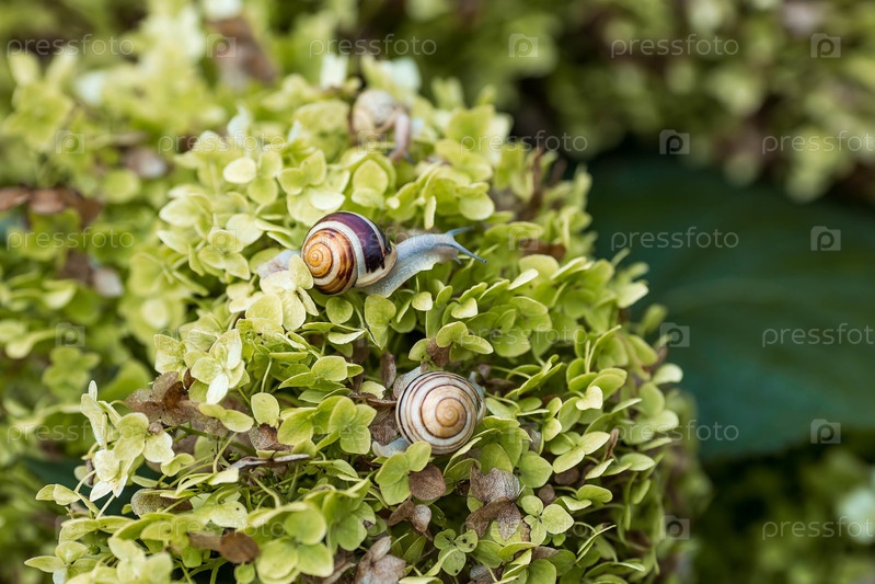Наземные гастроподы моллюски семейства Helicidae. виноградная улитка (Helix pomatia) на цветущей гортензии. садовый вредитель. съедобная улитка
