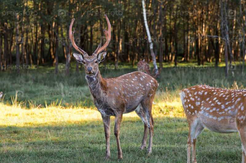Портрет. олень с красивыми разветвленными рогами в естественной среде обитания, в лесу на частной экоферме. скотоводство. любовь к животным