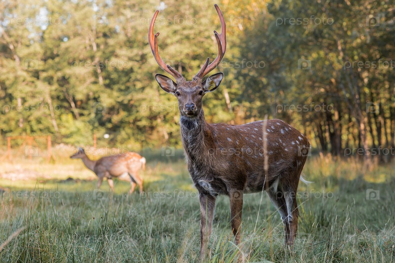 Портрет. олень с красивыми разветвленными рогами в естественной среде обитания, в лесу на частной экоферме. скотоводство. любовь к животным