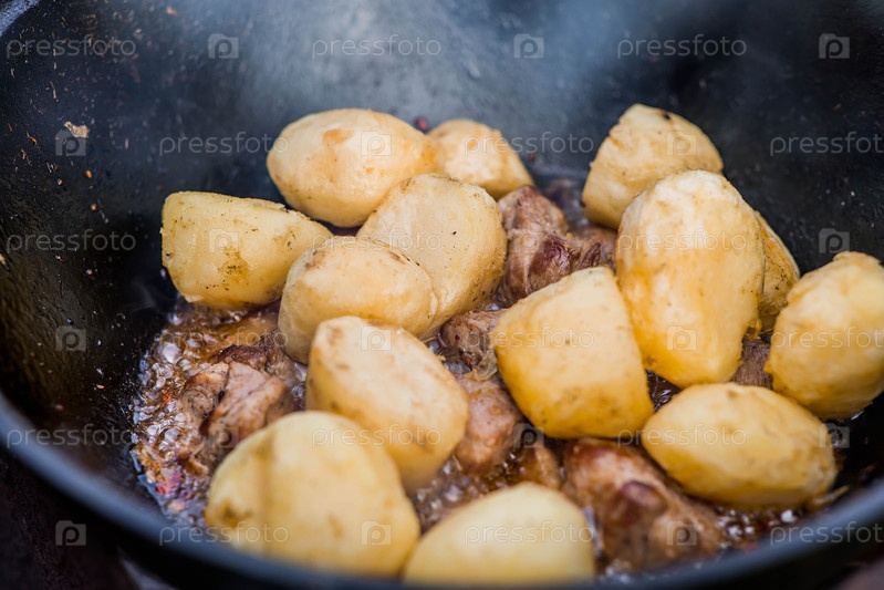 Подготовка рецепта приготовления мяса с картофелем в чугунном котле на открытом воздухе. Приготовление пищи. Печь мясо