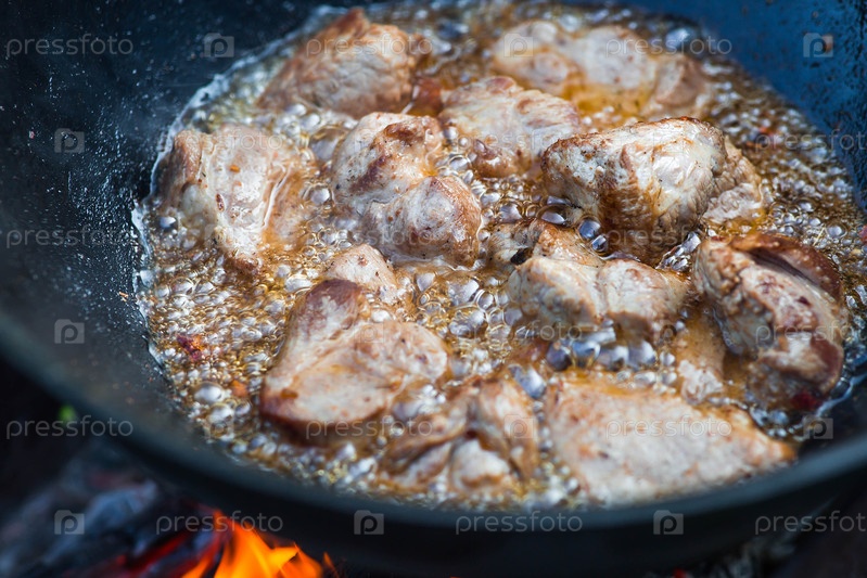 Рецепт приготовления мяса в чугунном котле на открытом воздухе.Приготовление пищи.Жарное мясо