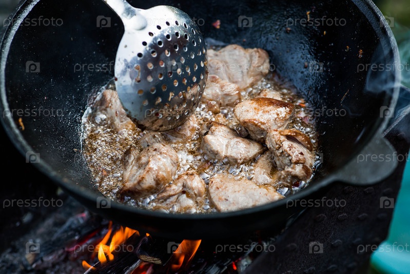 Рецепт приготовления мяса в чугунном котле на открытом воздухе.Приготовление пищи.Жарное мясо
