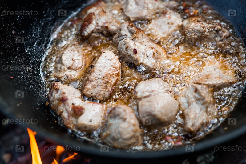Рецепт приготовления мяса в чугунном котле на открытом воздухе.Приготовление пищи.Жарное мясо