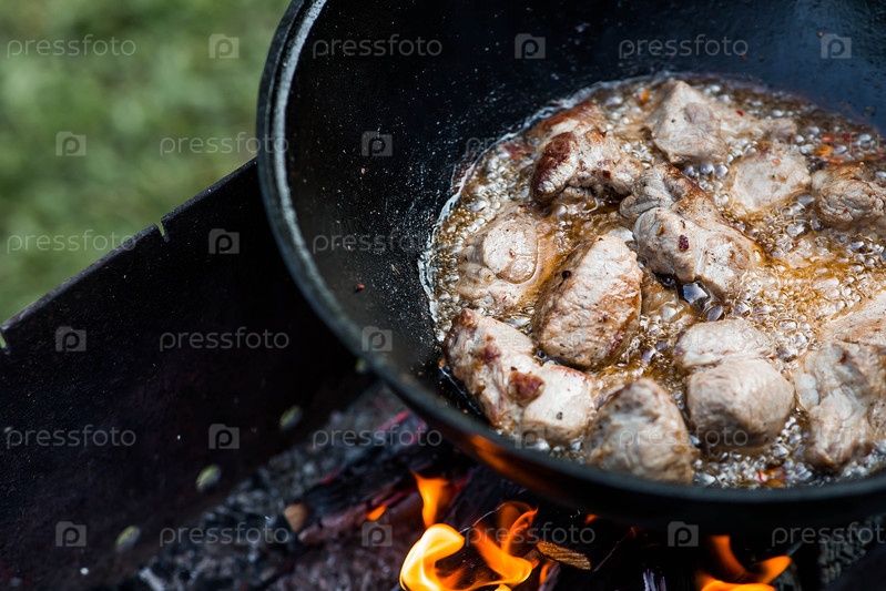 Рецепт приготовления мяса в чугунном котле на открытом воздухе.Приготовление пищи.Жарное мясо