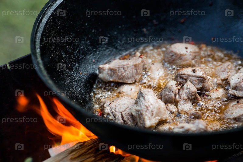 Рецепт приготовления мяса в чугунном котле на открытом воздухе.Приготовление пищи.Жарное мясо
