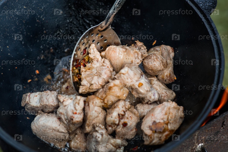 Рецепт приготовления мяса в чугунном котле на открытом воздухе.Приготовление пищи.Жарное мясо