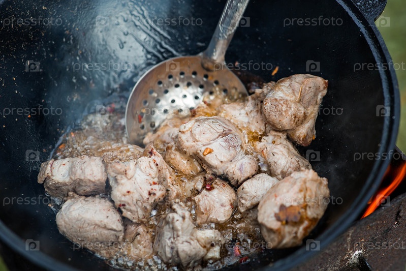 Рецепт приготовления мяса в чугунном котле на открытом воздухе.Приготовление пищи.Жарное мясо