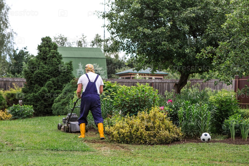Концепция садоводства и деревенской жизни. Человек-косилка косит траву на заднем дворе. Сельскохозяйственное оборудование для содержания сада. Баннер