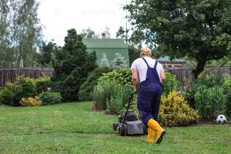 Концепция садоводства и деревенской жизни. Человек-косилка косит траву на заднем дворе. Сельскохозяйственное оборудование для содержания сада. Баннер