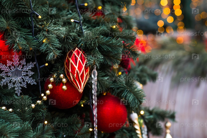 Красивый рождественский фон. Праздничные игрушки на елке в традиционных красных цветах. Концепция подготовки и украшения к Новому году. новогодняя открытка 2026