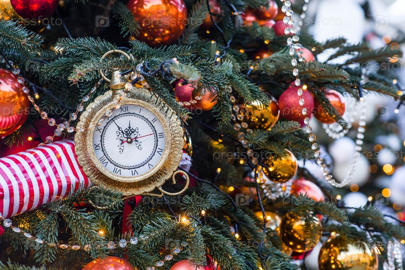 Часы на циферблатах показывают 12 часов. Золотые ретро-часы на рождественской елке. Красивый фон в канун Нового года или Рождества 2026