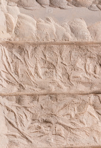 Фрагмент текстуры бежевой каменной стены, параллельные большие каменные плиты. Свернутая поверхность. Копия пространства. Вертикальный вид