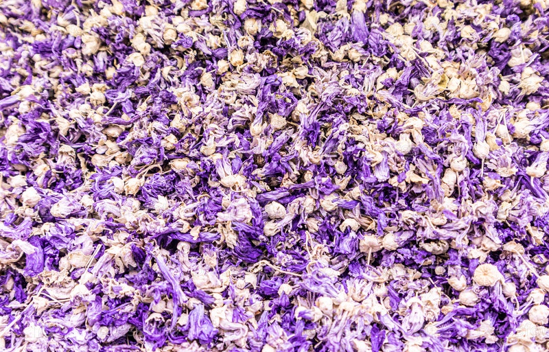Голубой фон сушеных цветов сухой кукурузной капусты. Синие цветы вкусного цветочного чая. Богатый цвет и вкус чайных лепестков кукурузы