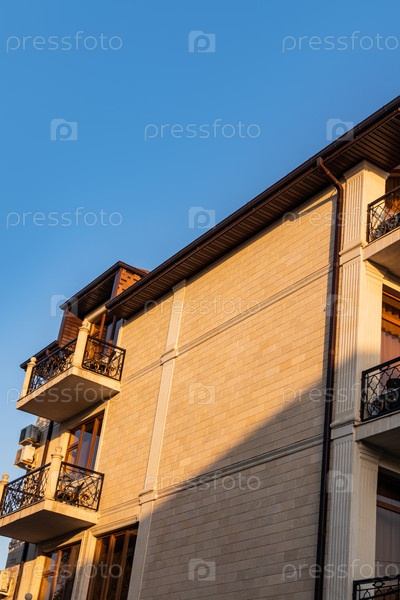 Фрагмент красивой боковой стены жилого дома со стильными стеклянными балконами окутан солнечными лучами