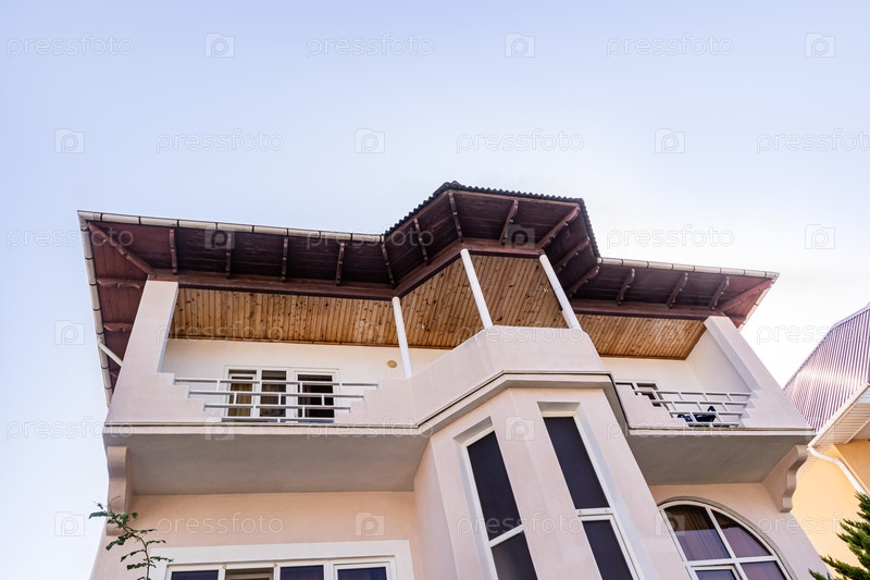 Вид с нижней части роскошного городского здания жилого или гостиничного типа. Белые красивые балконы, подводные окна. Легкое архитектурное решение
