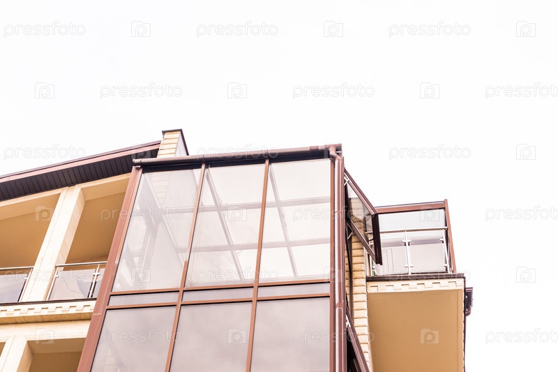 Современное городское здание с большими стеклянными окнами, стильный балкон. вид сверху. архитектурные детали дома