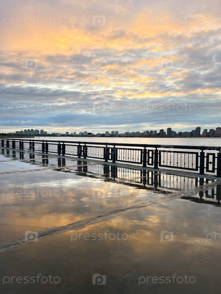 Закат на берегу после дождя.Отражение яркого заката в мокрой тротуаре, Казань, Россия