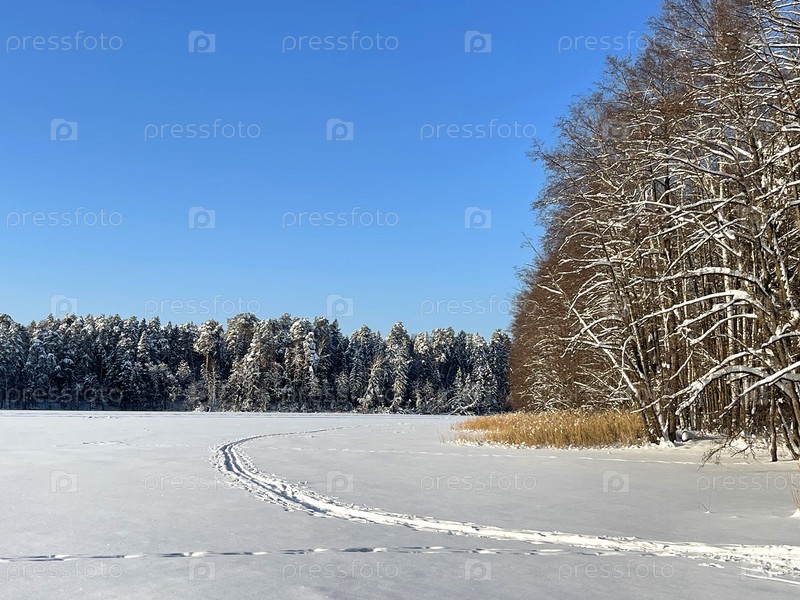 Озеро покрыто льдом и снегом в лесу в солнечный зимний день