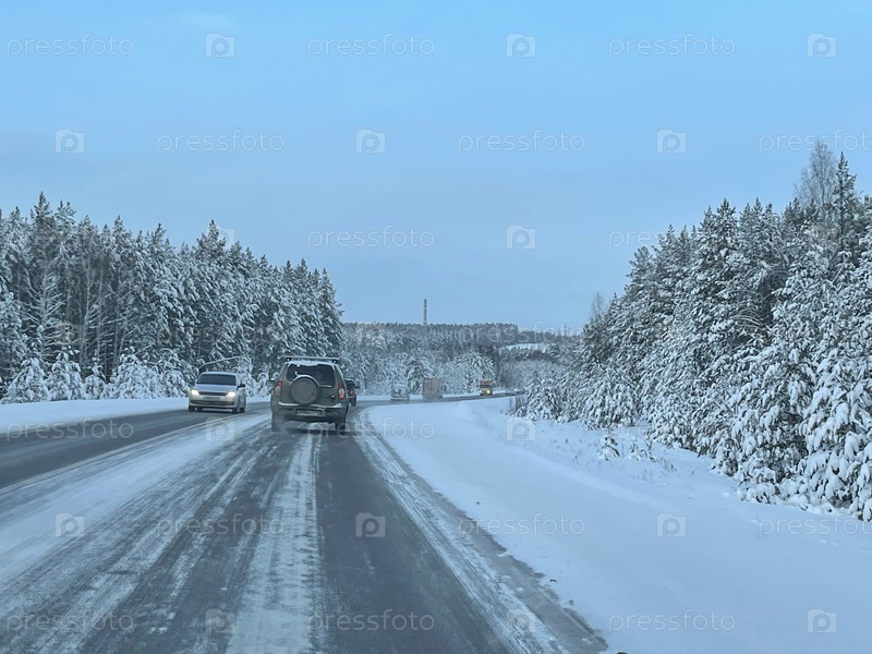 Дорога проходит через зимний лес, покрытый снегом, Россия