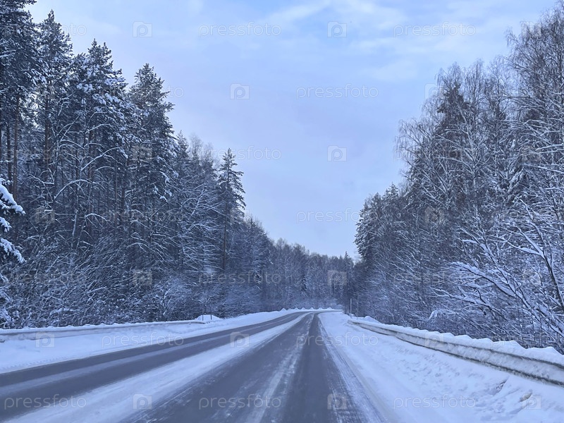 Дорога проходит через зимний лес, покрытый снегом, Россия