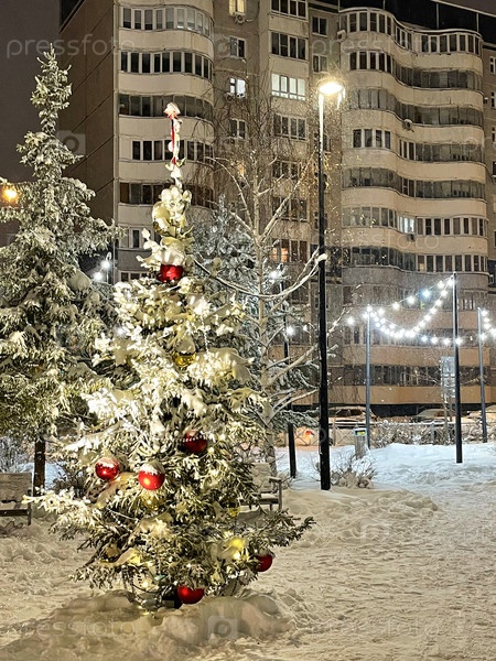 Красивая зимняя улица в снегу с рождественскими украшениями, Казань, Россия