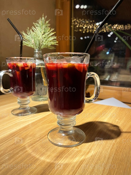Два бокала горячего вина в новогодних декорациях