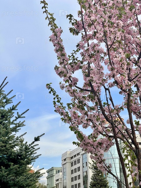 Весна в городе - розовое цветущее дерево, зеленая ель и жилой дом