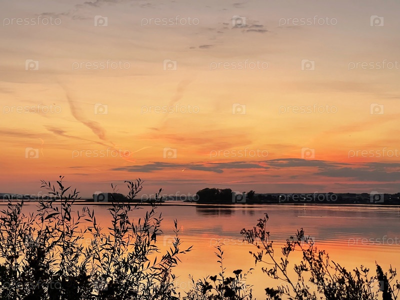 Яркий закат солнца над рекой Волга возле Казани, Россия