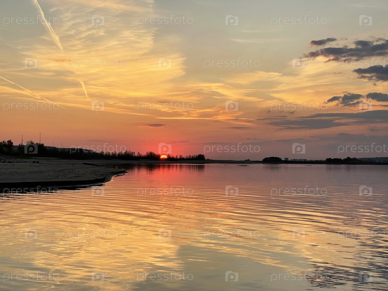 Яркий закат солнца над рекой Волга возле Казани, Россия