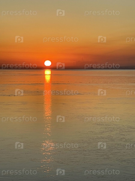 Яркий закат солнца над рекой Волга возле Казани, Россия