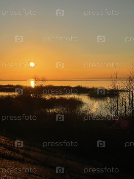Красочный закат солнца в драматическом небе над рекой Волгой возле Казани, Россия