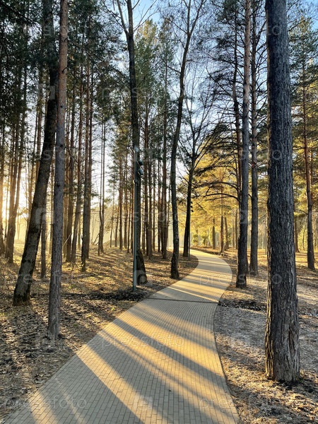 Красивая лесная сцена с солнечным светом, проходящим через высокие деревья, создает теплую и привлекательную атмосферу.Деревянный путь изящно извивается по лесу, гармонично смешиваясь с природой и приглашая вас исследовать