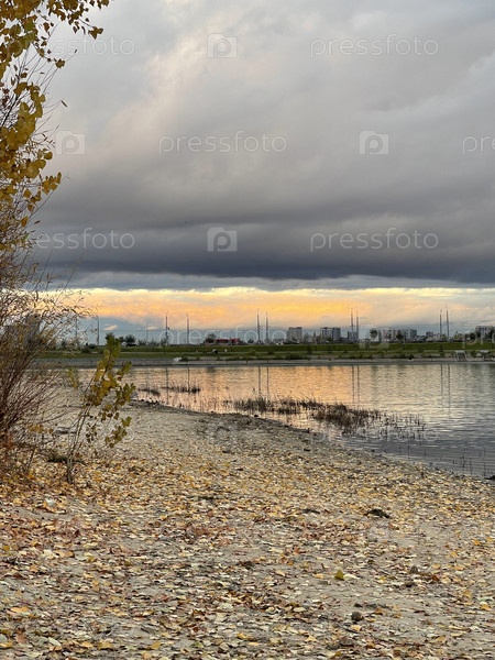 Красивый драматический закат солнца на берегу реки Казанка в Казани, Россия
