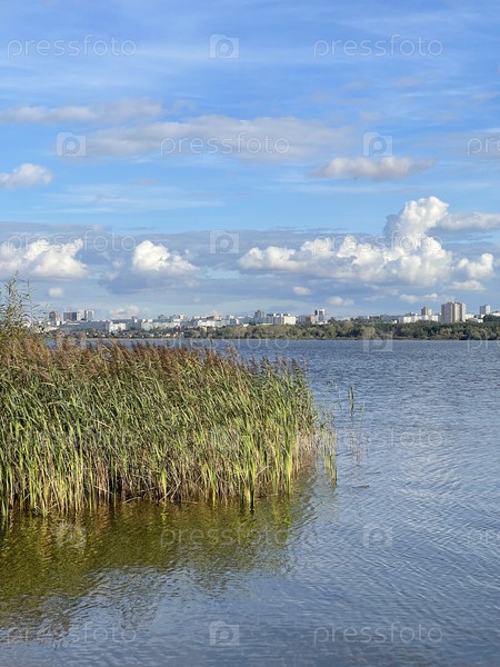 Вид на город Набережные Челны с берегов реки Камы в солнечный летний день, Татарстан, Россия