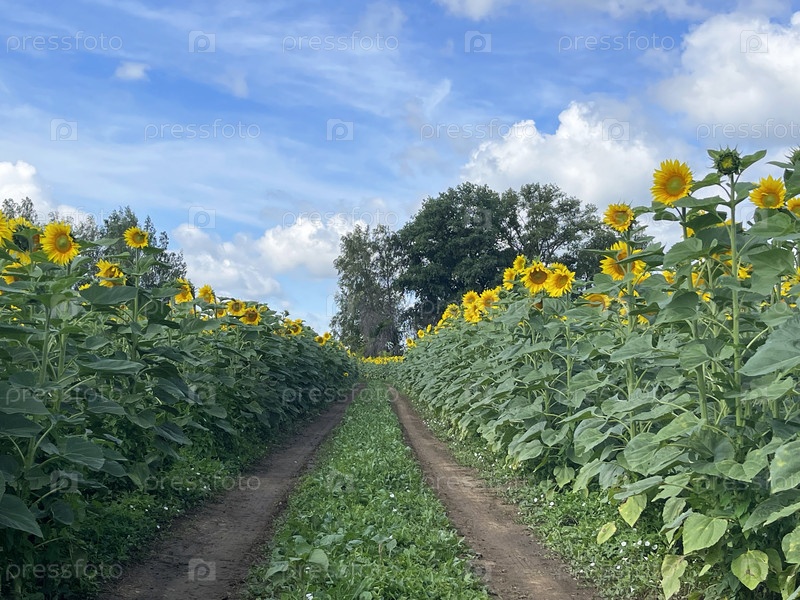 Сельская дорога, проходящая прямо через поле подсолнечника в солнечный день