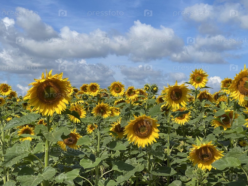 Поле подсолнечных на фоне голубого неба с облаками в солнечный день