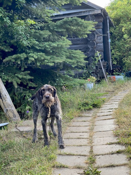 Собака Дратаар сидит на цепи возле дороги в деревне