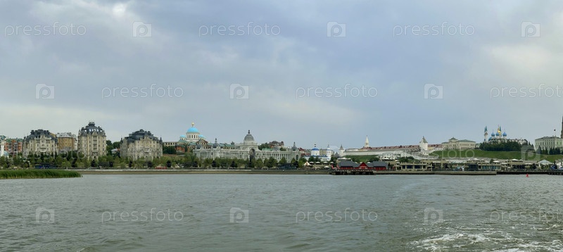 Панорамный вид на центр Казани и реку Казанка в пасмурный летний день, Россия