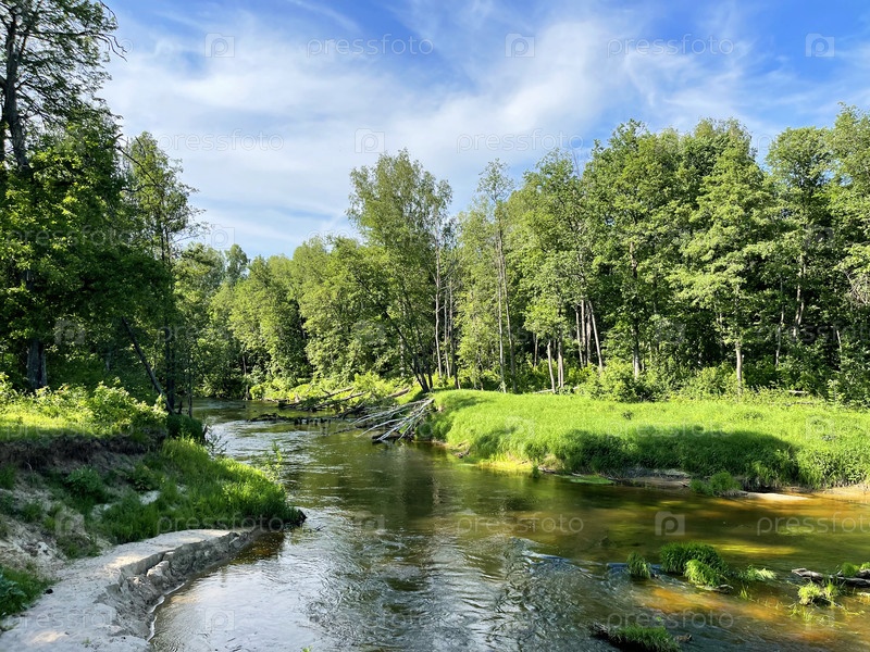 Красивый пейзаж, маленькая речка в лесу в солнечный летний день