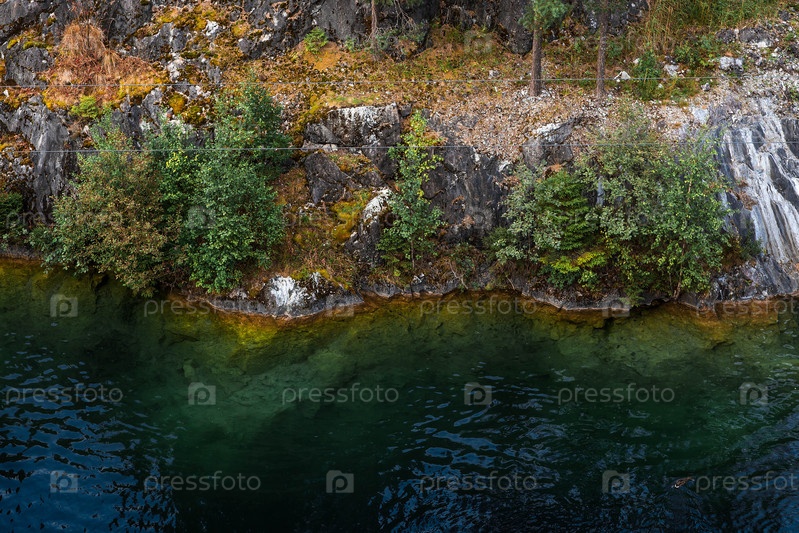 Летний пейзаж горного парка Рускеала. Бирюзовый и мраморный каньон летом. Россия, Республика Карелия, деревня Рускеала