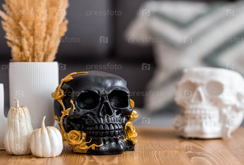 Празднование Хэллоуина. чёрный череп с золотыми розами и тыквами на столе. украшение для Дня мертвых или Хеллоуина в гостиной