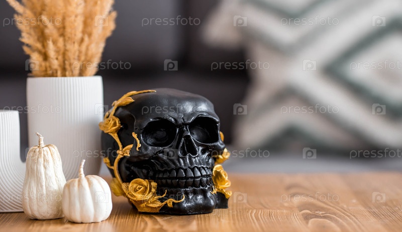 Празднование Хэллоуина. чёрный череп с золотыми розами и тыквами на столе. украшение для Дня мертвых или Хеллоуина в гостиной