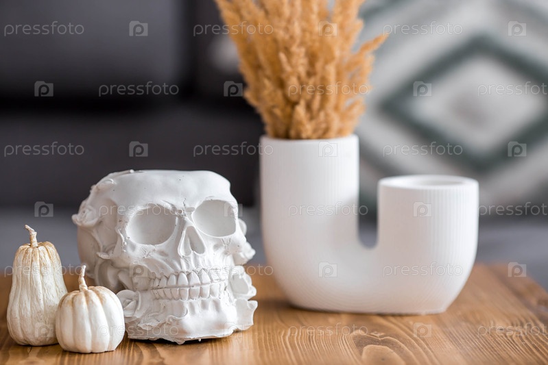 Белый череп, свечи и тыквы на столе.Декорация для Дня мертвых или Хэллоуина в гостиной