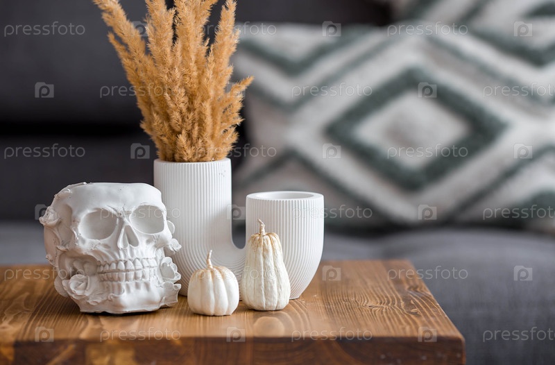 Белый череп, свечи и тыквы на столе.Декорация для Дня мертвых или Хэллоуина в гостиной